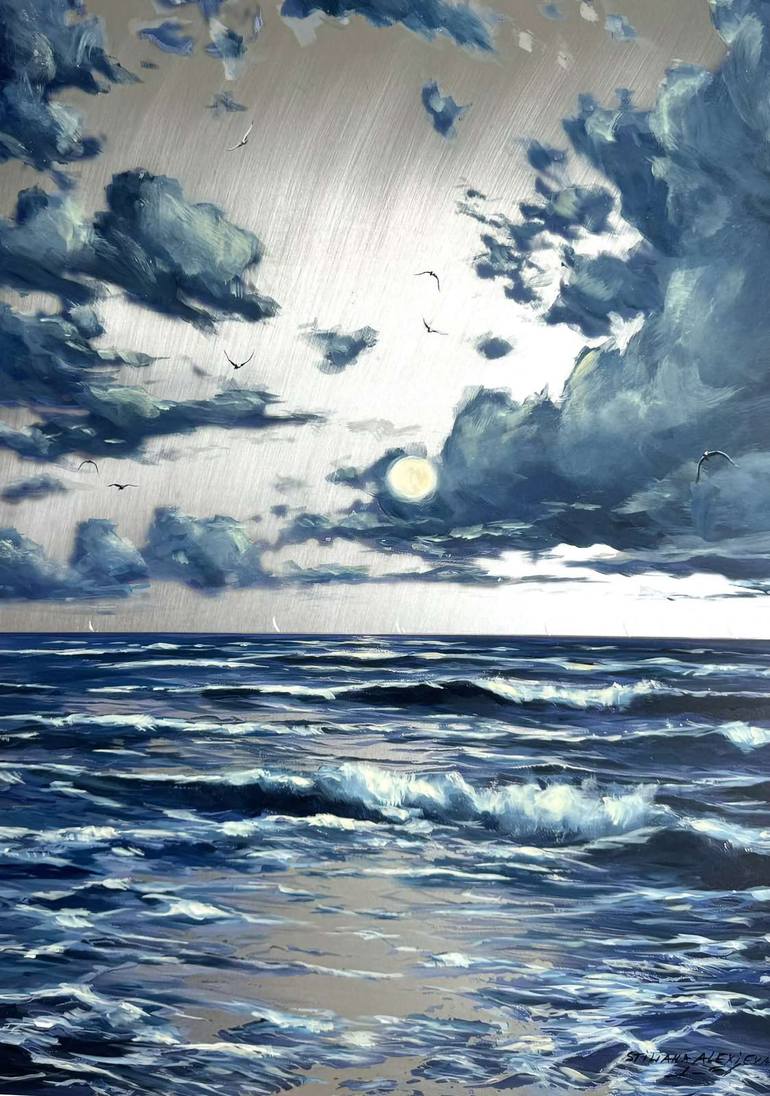 I paint on raw sheets of aluminium. Through self-developed artistic techniques, I incorporate the paint with the reflective surface. The different lights of the day are performed onto the metal, creating a play of foreground and background effects, and ever-changing scenery.
