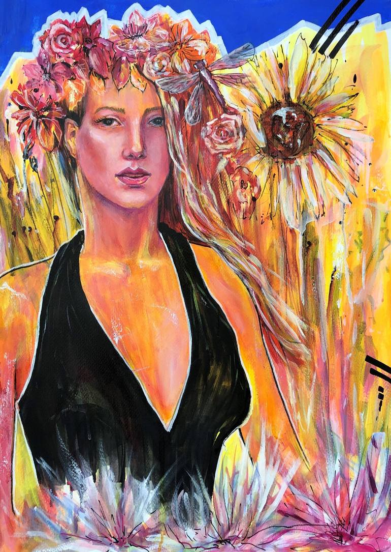 "Luminous nymph” original painting on paper with professional and high quality. The dimensions are 70 cm x 50 cm. Oil, mixed media. In this piece with a summery mood, I have expressed the beauty of nature, of life`s moments, happiness, and tranquillity. I put many yellow, orange, the colors of hap...