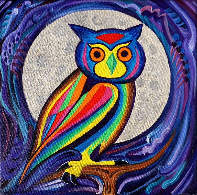 The wide-eyed wisdom of the feathered owl friend envelops you with a heartfelt hug in the twilight of life. Your sight obscured by night you look towards the heavens and see the motherly moonlight! I've always loved owls & the moonlight at night so I created this piece a couple months out of my 5-y...