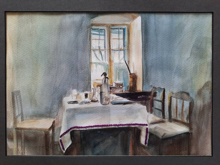 A small restaurant in Etyek, the sun shines in at noon. A little embroidery on the tablecloth, mixed media.