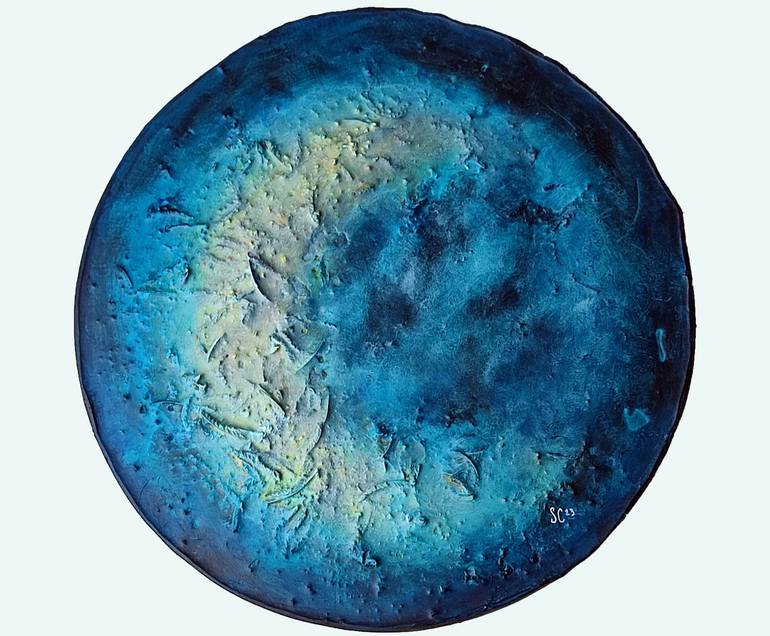 This earth moon, dried mimosa leaves, resin, acrylic and pigments on an upcycled plywood panel. A crescent moon in the roundness of its support. In this work Sc pays a luminous tribute to our benevolent satellite. This original work is sold with a ring ready to be hung, a small different format. co...