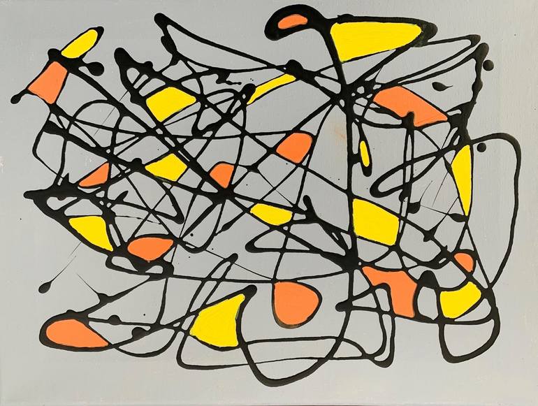 This artwork features a dynamic interplay of black, white, yellow, orange, and grey. The drip and drop application techniques, inspired by Abstract Expressionism, add depth and texture, creating a unique visual experience. The bright colors and lyrical lines evoke a sense of movement and emotion, re...