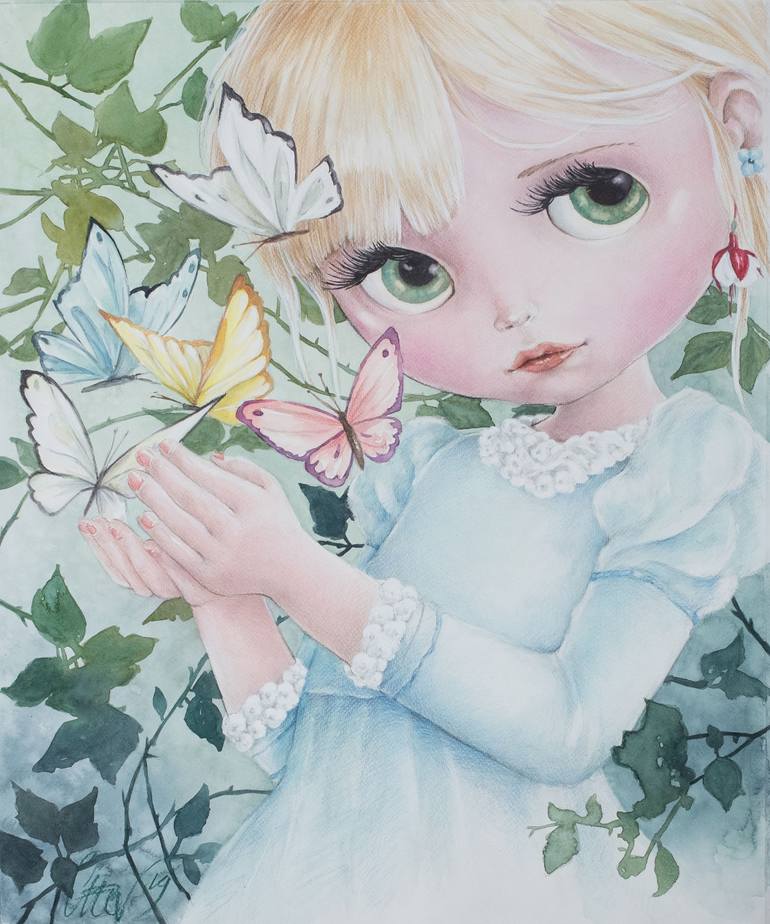 Mij inspireert de Blythe poppen cultuur met een Japanse twist. Hiermee wil ik de kijker een vrolijk en fijn gevoel geven. Dit alles komt het best tot uiting in mijn realistische illustratieve stijl op het Franse Canson Montval papier.