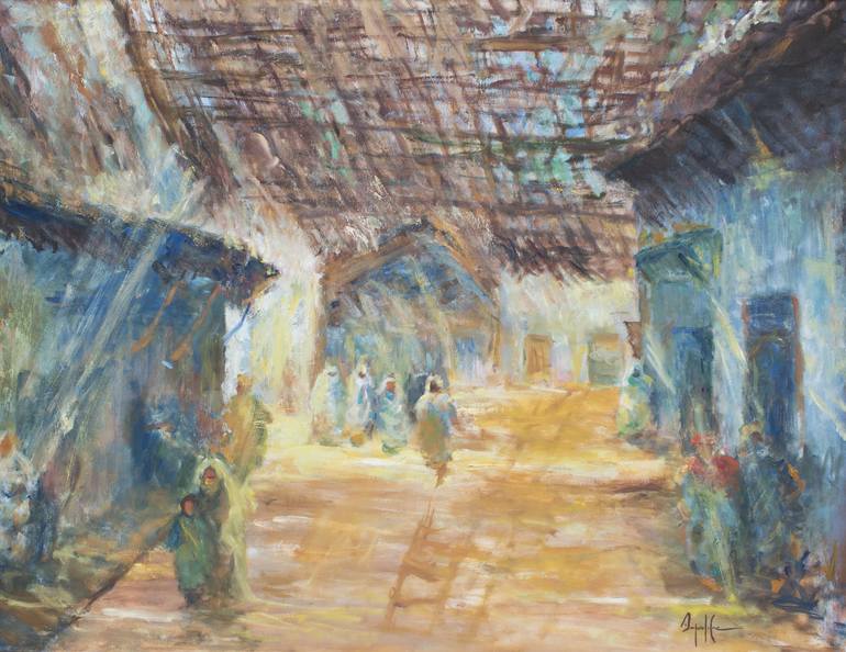 PAINTING MARRAKECH SOUK AT MIDDAY WITH COLORFULL LIGHT.