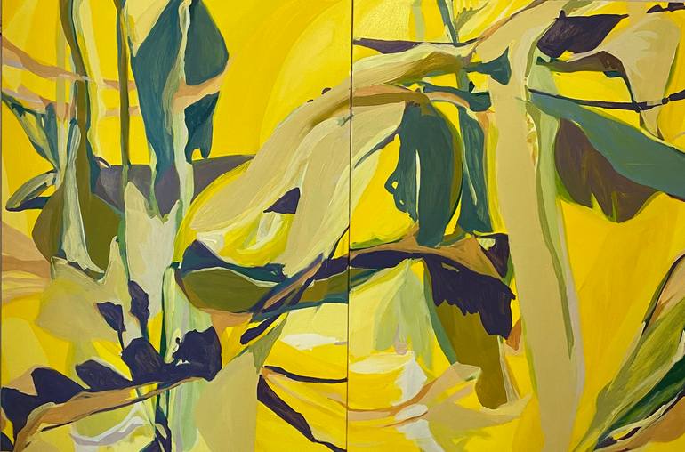 "MEANWHILE" is a vibrant yellow abstract oil painting presented as a diptych. Part of the artist's "WORSHIP" series, this captivating artwork captures the essence of transformation, mirroring nature's awakening as the earth warms and life bursts forth. Like a bright morning light, it evokes a sense ...