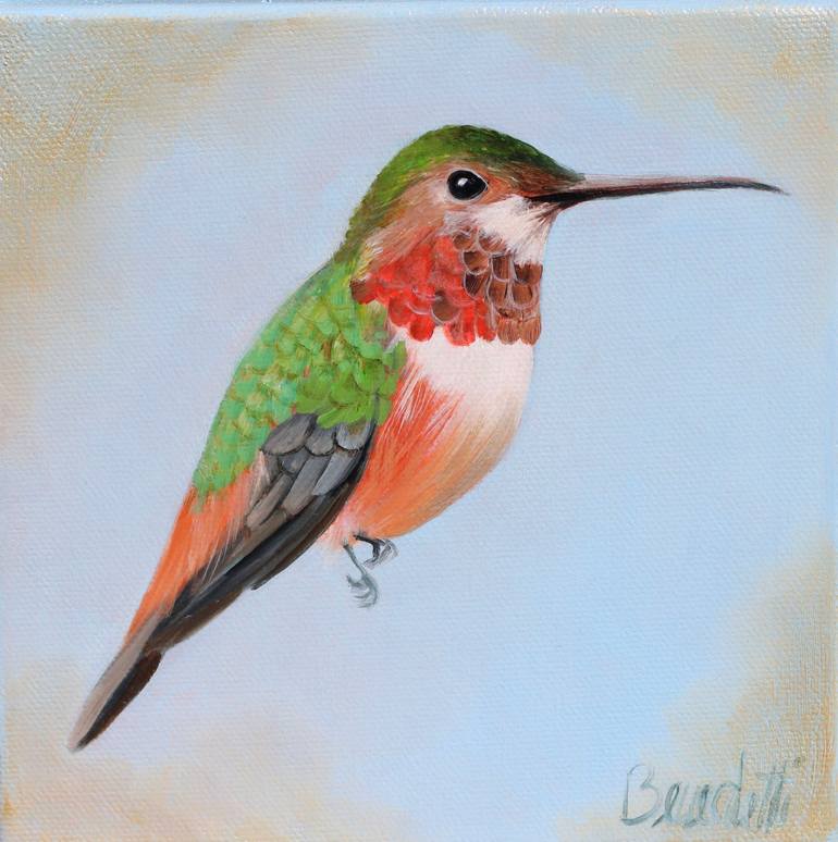 High Quality Oil on Canvas 6 in. x 6 in. 15 cm. x 15 cm. Ships in a box Free shipping included One of a Kind Piece This small and very colorful painting is part of the collection REALITY BITES. It has a light blue with gold. The hummingbird is a symbol of God's grace, power and speed. It also rep...