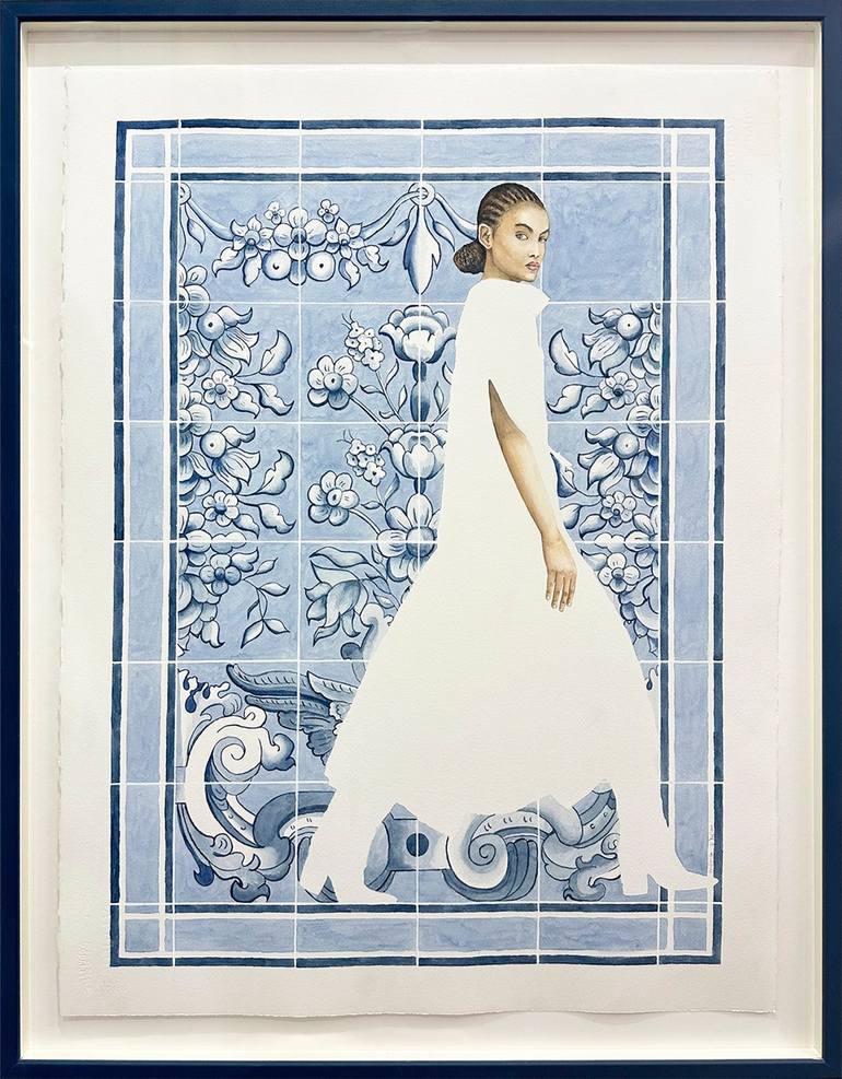 The painting is part of a series featuring extracts from azulejos, a recurring feature of my heritage, combined with an absence of paint. The dynamic figure contrasts with the statuesque figures traditionally featured in the borders of azulejo panels, this striding catwalk figure breaks through the ...