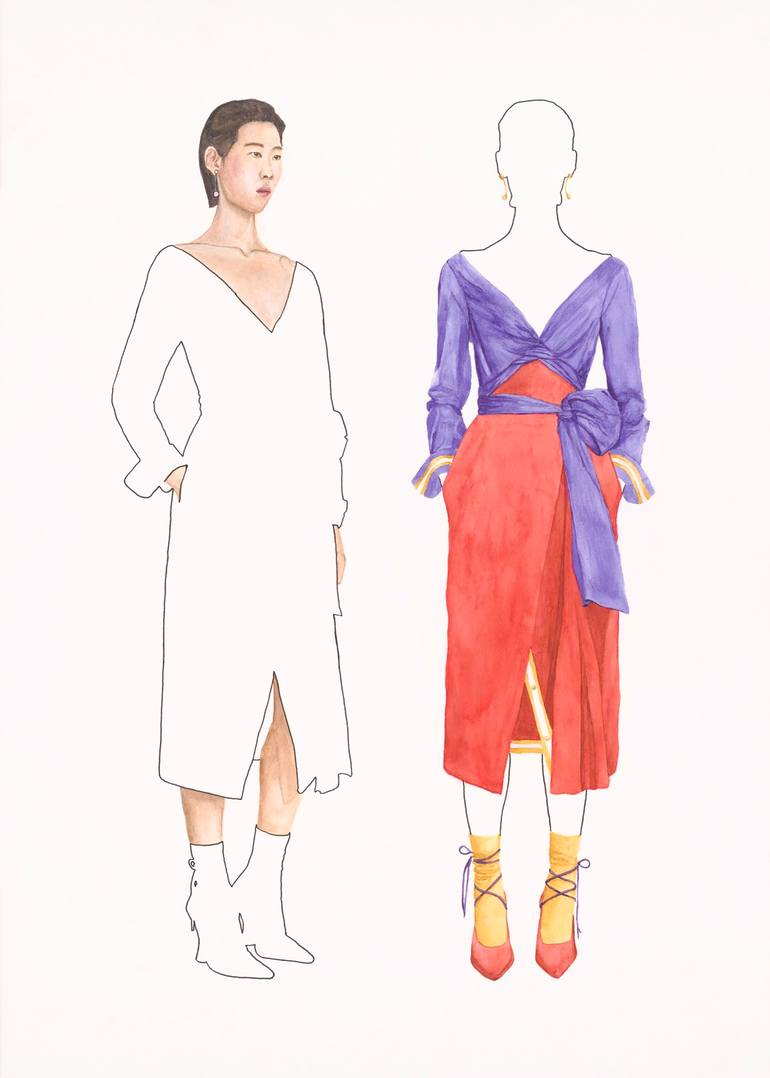 This painting is part of a series of works inspired by fashion photography. It shows two opposing figures. Visually they complement one another; the absence of colour in one contrasting with the rich colours of the other, as well as the focus on the individual (figure on the left) alongside the clot...