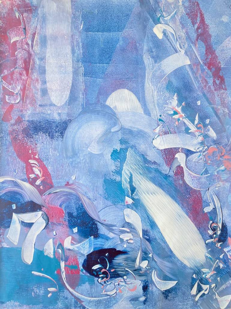 MOONLIGHT FAIRIES is a dreamlike abstract painting that captures the essence of an enchanting nocturnal scene. Layers of textured blues, whites, and soft reds evoke the mystical glow of moonlight illuminating a fantastical, ethereal landscape. Delicate swirls, organic shapes, and fragmented forms su...