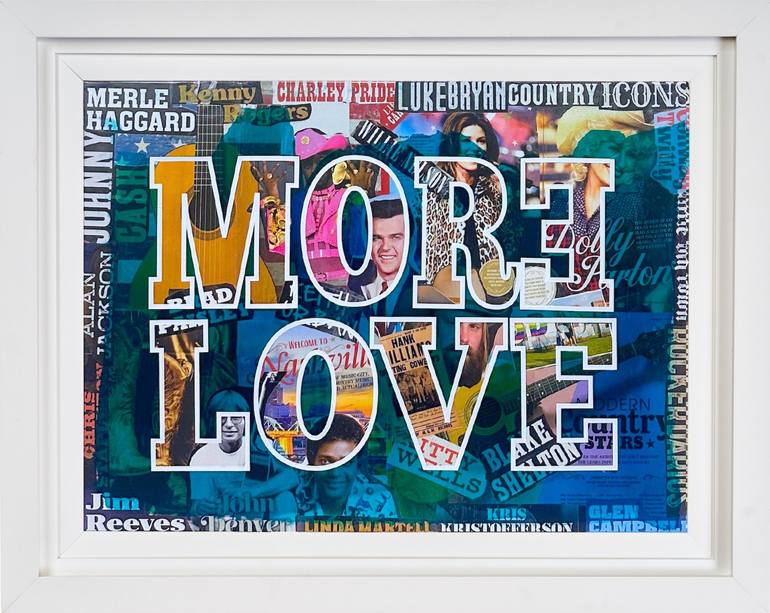 This new pop art piece titled “MORE LOVE” is a vibrant homage to country music and its iconic stars, combining nostalgic elements with a modern, pop-inspired aesthetic. The phrase “MORE LOVE” is embedded in a collage of famous country musicians, album covers, and classic images from the world of cou...