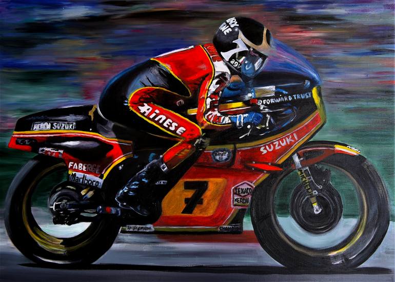 This artwork was inspired by British legends of professional motorcycle racing. Oil painting, Canvas One of a kind artwork Size: 50 × 70 × 2 cm (unframed) The artwork is titled and signed on the front and also comes with a certificate of authenticity. The painting is ready to hang and has painted ...