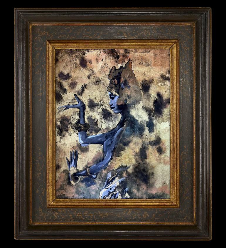 The dancer’s mudras symbolize the five elements—earth, water, fire, air, and space—each associated with specific meditation hand positions. These mudras help channel and balance the body's energy flow.The use of antique gold and different textures conveys a sense of the ancient and the mystical.The ...