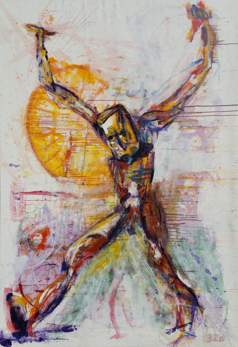 The figure could be a machine - in a time when machines are a lot like us. The figure could be quietly asking for help. This painting would be shipped rolled up with glassine paper. The buyer would probably want to stretch the painting. Like 3rd Day, this painting was one of the first, larger figura...