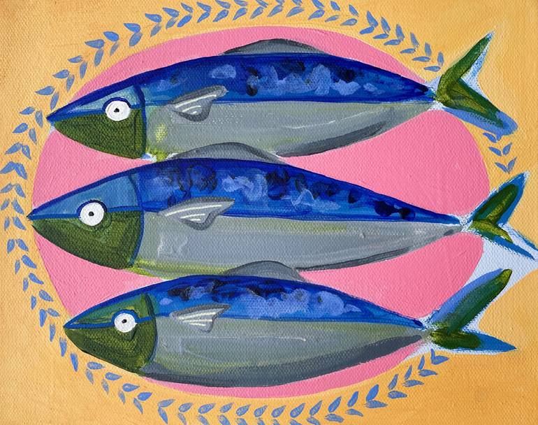 Mackerel, 2023. This collection of smaller still-life paintings, is focused around themes of femininity, friendship, table-settings, gathering over good food and drinks with loved ones.