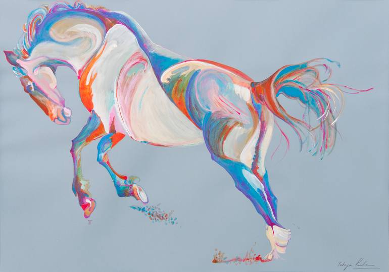 Yaheya is an equestrian artist creating fine art paintings and drawings of horses. She has been passionate about drawing and colour since childhood which led to her studying at Central Saint Martins College of Art and Design from where she graduated with a (BA Hons) degree. Horses have been part of her Indian family background for generations. Her grandfather was a keen horseman and polo player whilst her father and mother both grew up with horses. Yaheya loves to watch horses especially when they are free, having fun and also enjoys meeting clients who share a close bond with their horses. This is reflected in the mood and movement of the horse and that is when the magic happens for her. In their effervescent movements, as their bodies catch the light interspersed with shadows, Yaheya sees dazzling colours. The work harmoniously marries three dimensional elements with those of linear shapes and bold lines that punctuate the muscle tension of the horse and capture it's spontaneity, add to this layers and layers of vivid brilliant paint and the viewer is transported into Yaheya's realm of personal fantasia, as the horse is seen through her eyes. Her paintings are a visual feast where her audacious colour palette does not shy away from sunset orange-reds, violet blues, deep pinks, turquoise and deep bottle green contrasted against silvery greys, creamy beige hues and porcelain white. Her style is very definitely expressionistic but one is also reminded of Fauvism in her choice and application of colour, influenced by Mikhail Vrubel, Edmund Dulac, and her love of manga anime. She explains she is on an adventurous journey where each new work presents challenges and rewards paving the way to new and exciting ideas to draw and paint. Her equestrian work is collected in many countries worldwide, amongst them America, Germany, UK and Switzerland.