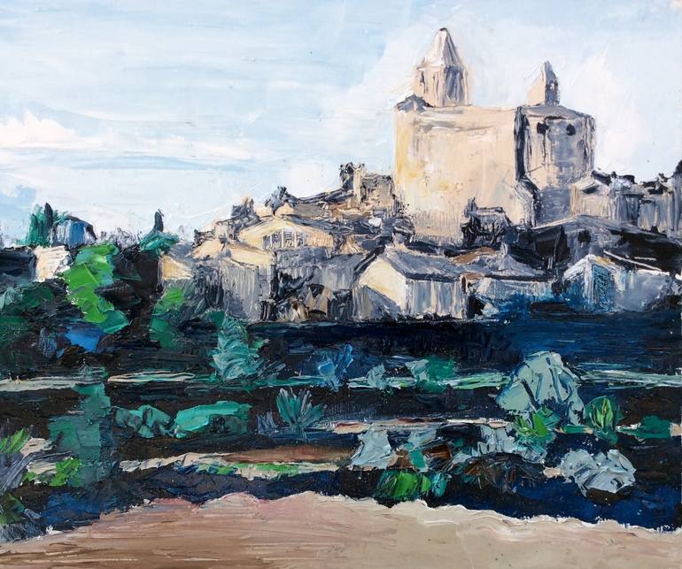 After the rain there is a break in the clouds. Here is a local medieval village in the shadows and brilliance of the setting sun. Catalonia, Spain in blue. All paintings are signed on the back and have 2 hooks and wire for easy hanging. Sides are white.