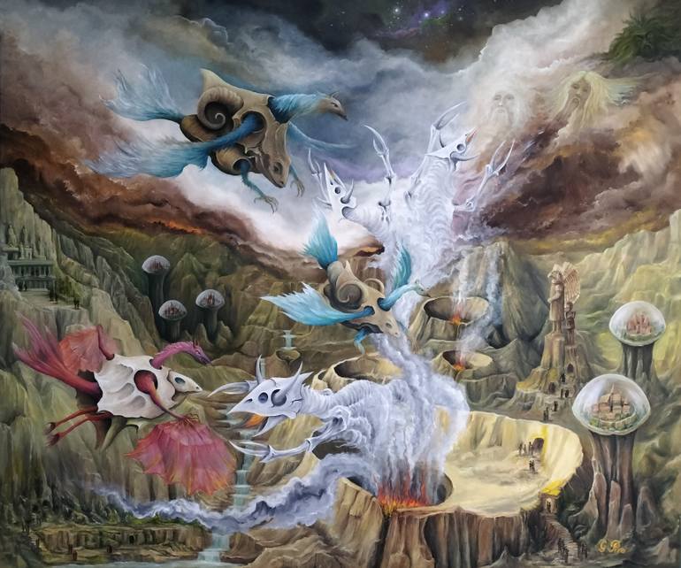 This is a Gregory Pyra Piro oil painting ref 420350 of multiple styles of surrealism, landscape and symbolism. The scene shows a mountain valley with a ravine that takes place on a planet from a distant solar system. There are blue dragons with skull vests and red dragons with skull vests. There are...