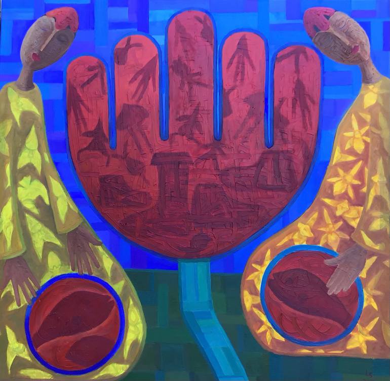I was inspired by thoughts about two women and friendship between them. A big flower in the middle is the symbol of beauty in relationship, inside the flower are shoe's forms houses, it means rarity, like a good friend. This artwork I started in 2017 and finished in 2020.