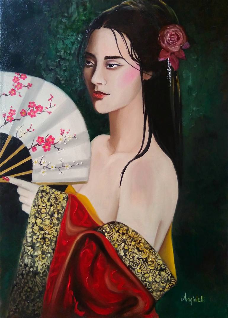 Portrait of geisha with fan - painted with oil colors on canvas of 50x70 cm - signed on the front and colored also on the edges, it can also be hung without a frame