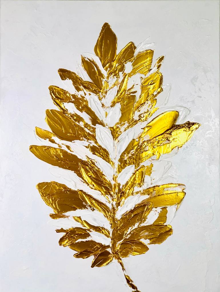This painting reflects a continuation of modern elegance with a minimalist and luxurious aesthetic. The use of heavy body impasto metallic gold acrylic alongside a subtle textured white base, creates a striking contrast that draws the viewer’s attention. The leaf's textured details, applied with a p...
