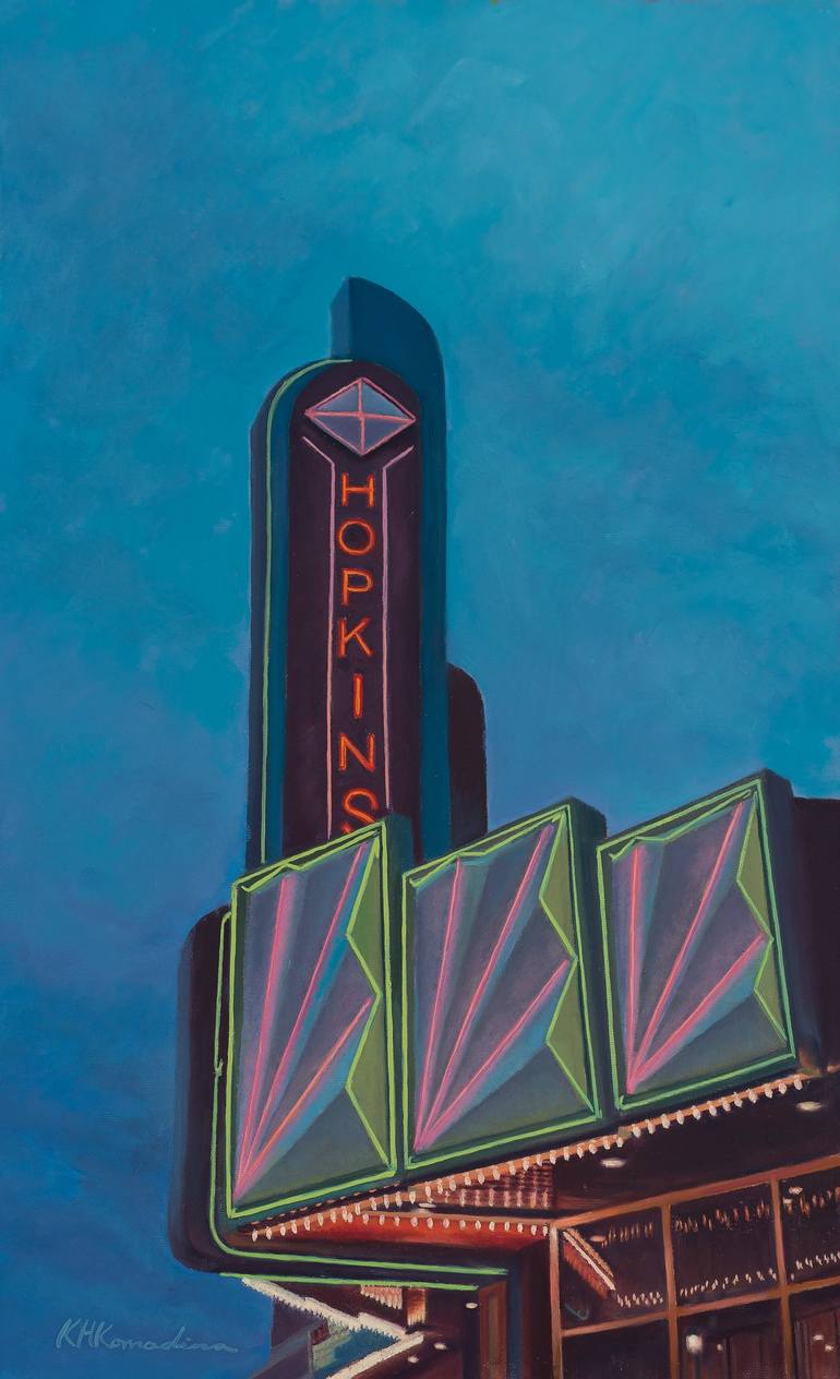 A vintage theater marquee in a small suburb or Minneapolis reflecting a bygone era of style and design. The abstract elements of the design and bright neon inspired this painting. Series: America the Beautiful
