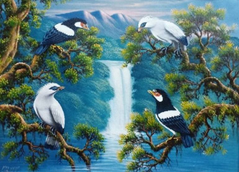 Majestic Harmony: Four Starlings in a Natural Paradise. Elevate your space with the serene beauty of this captivating painting. 'Majestic Harmony: Four Starlings in a Natural Paradise' depicts four exquisite starlings perched on tree branches, set against a breathtaking backdrop of a cascading wat...