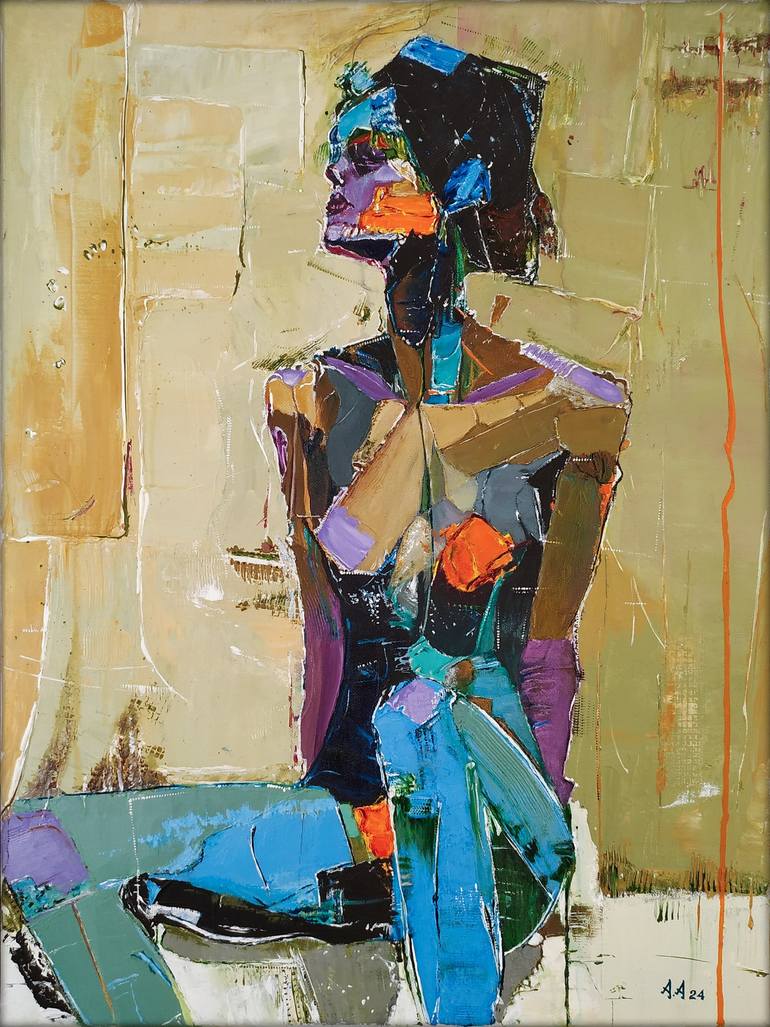 "Malachite Intonation" is a striking painting that portrays a seated female figure, created with a vibrant palette of colors. The woman’s form is composed of angular, abstract shapes, blending hues of blues, purples, oranges, and greens. Her posture suggests a sense of contemplation or introspection...