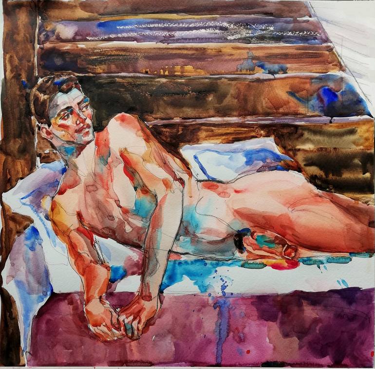Watercolor on Tintoretto 300gr Materials use< Finest artists' watercolours, Horadam Aquarell Nude figure that resonates with its surroundings; this interior reflects warmth through wood, and its colors, while his skin is still warm from the sun caught at the beach