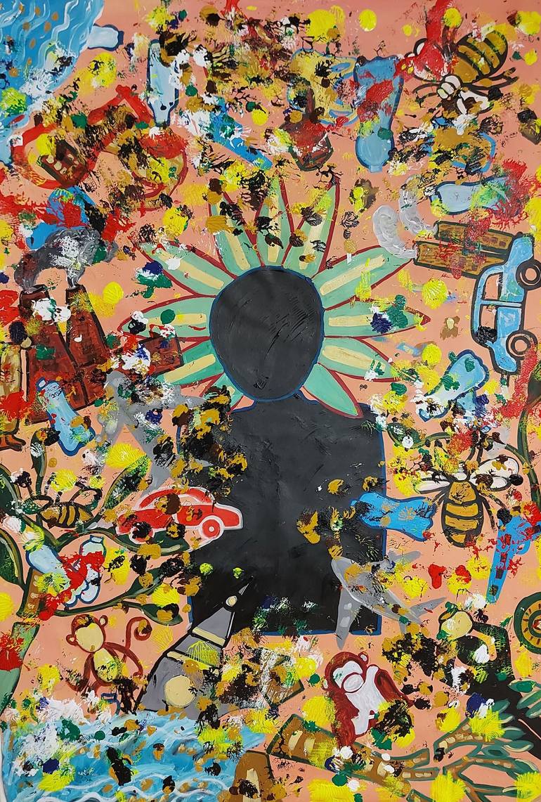 Man and His Environment This painting is inspired by the destruction of our environment by humans. This is why you find a figure in the middle of all manner of detritus. The rest of the narrative, I leave it to you. It is designed to be hung tapestry style, so it is unframed. It will arrive scroll l...