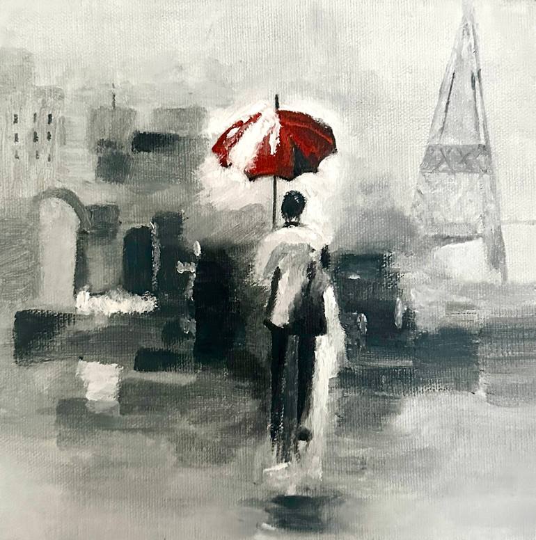The painting portrays a man walking through a rainy city, holding a red umbrella, and evokes a sense of contemplation and possibility amidst the unknown.