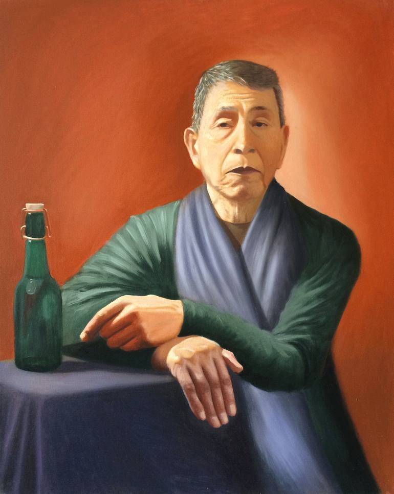 The impressionist style painting shows a Peruvian man dressed in a green sweater and a blue scarf. He is seated next to a table with a beer on it. He is in a bar alone. The light is coming from the left side, which emphasizes his facial features. He is looking seriously forward with his hands elegan...