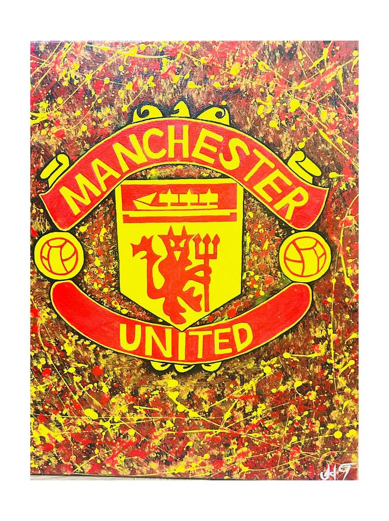 This painting features the Manchester United Football Club logo as its central element. The crest is predominantly red and yellow, with the iconic devil holding a trident at the center. The background is an abstract, splatter-paint design composed of red, yellow, and brown hues, giving it a dynamic ...