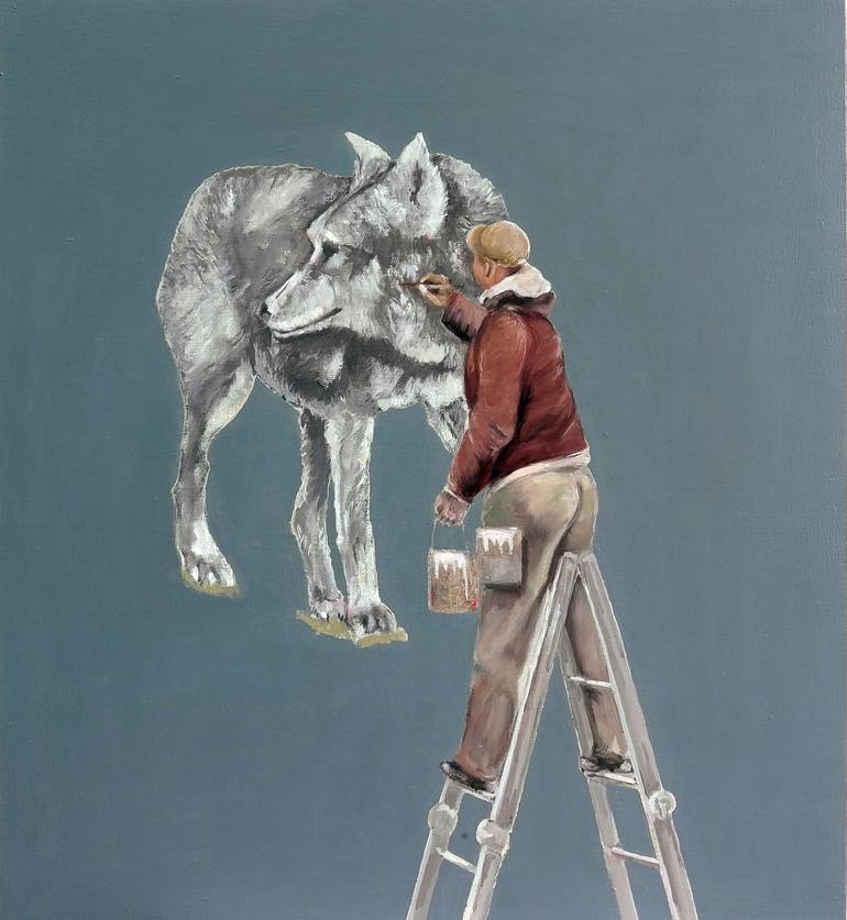 Mann Leiter Wolf Wolf als Methapher Tempera Untermalung Öl Malerei Leinwand auf MDF