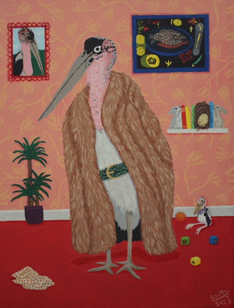 A Marabou Stork, part of the Ugly Animals In Cute Outfit series. The matriarch of the family, with baby in tow and another on the way, her other half is currently out getting fish but his presence hangs on the wall. In the upper right, Paul Klee's, 1926, "Around the Fish" painting hangs. A carnivore...