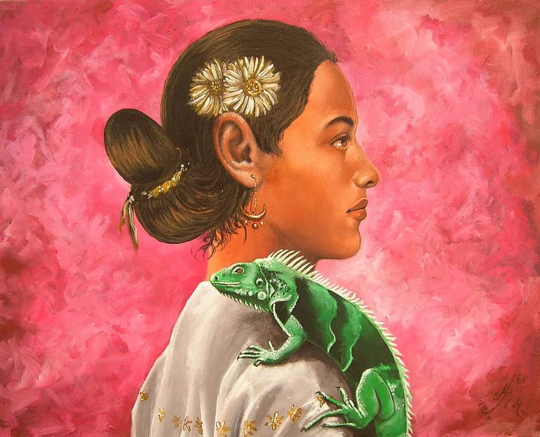Maria Clara is a southern Mexican girl who likes bringing on her shoulder her iguana pet.
