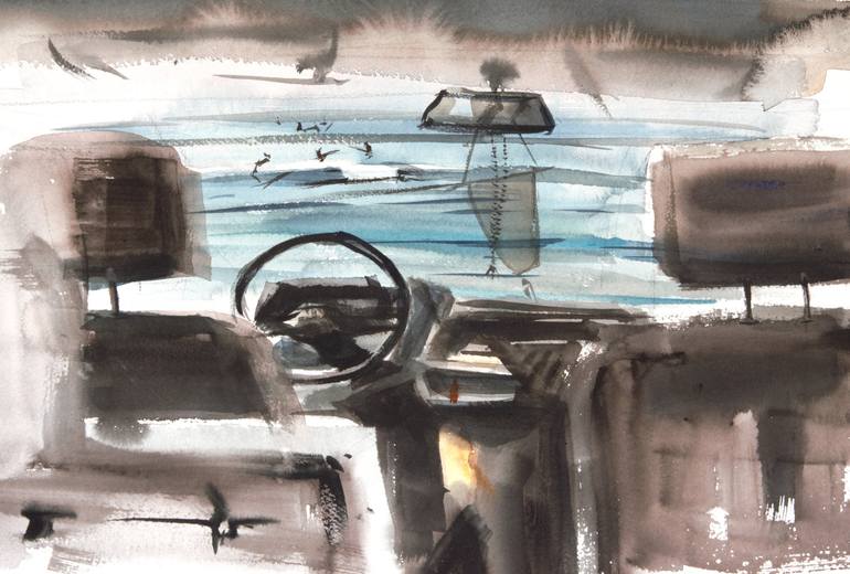 This painting captures the serene and idyllic view of the ocean from inside my caravan named Maria. We see surfers riding longboards on perfect waves. Painted en plein air, this artwork is a tribute to the beauty of the Portuguese coastline and the joy of surfing, as experienced from the comfort of ...