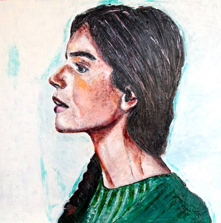 Portait, woman, young, modern figurative , encaustic and ink on wood