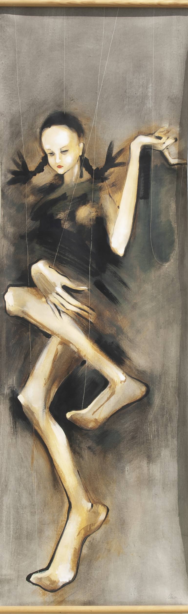 These pieces arise from the pain caused by the obligation of physical thinness, especially in women. Technically they are inspired by Goya's black paintings, but presented as a banner, with the loose canvas, without frames, attached to a wooden strip at the top and another at the bottom.