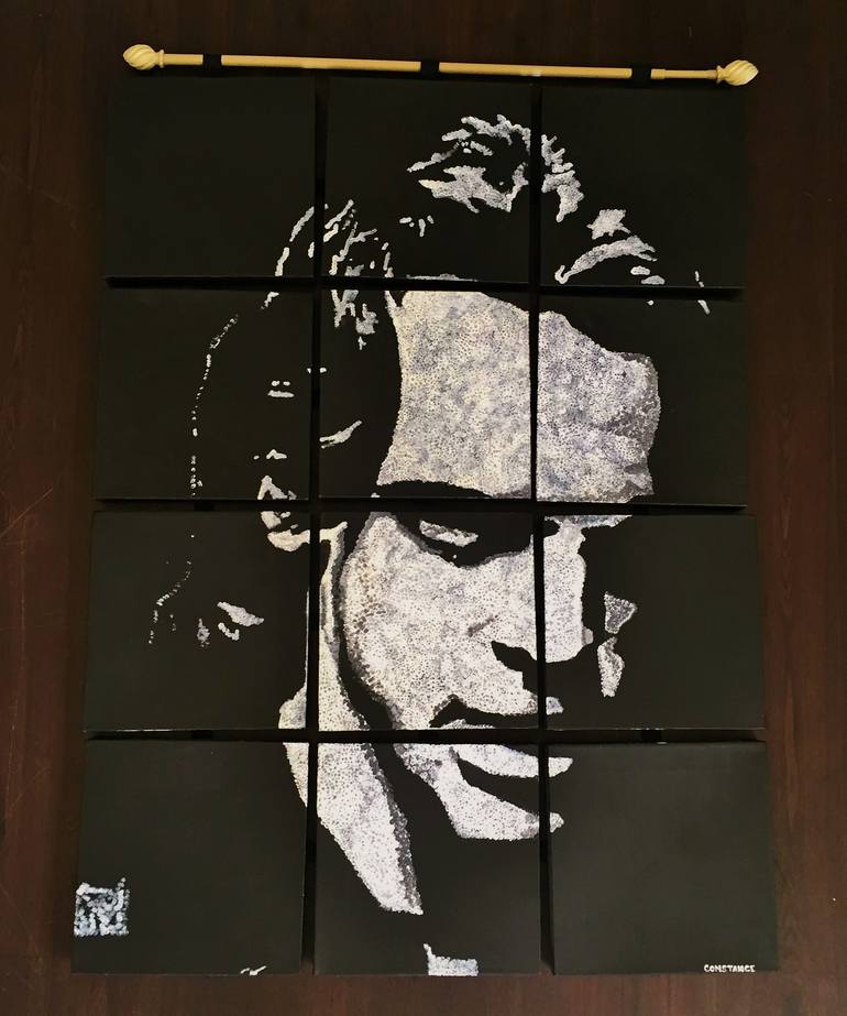 SUN KIL MOON or RED HOUSE PAINTERS fan? This is an original, multi-canvas pointillist painting of Mark Kozelek of Sun Kil Moon and Red House Painters. Each 10" x 10" canvas is attached together by black straps and suspended by a shower rod (or whatever rod you choose). Each canvas can be hung indi...
