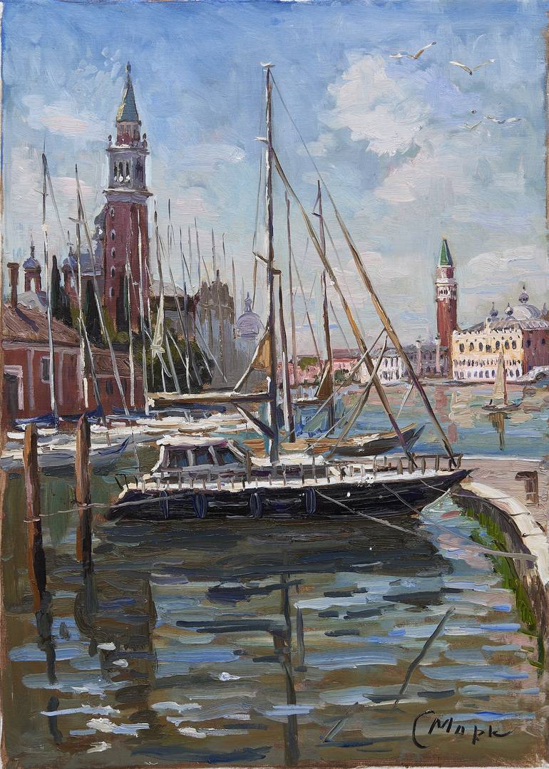 Towers of Venice. Yacht masts. The sonorous piercing composition of this canvas encourages the viewer to move, to great achievements. The picture is saturated with youth, hopes and an unquenchable thirst for life.