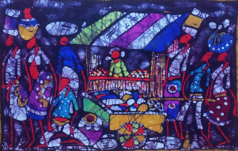 Market Harmony" transports viewers to a bustling African street market alive with color and culture. Villagers gather under a beautifully patterned canopy and a man push handcart bearing fruit and vegetables. Their figures rendered in abstract forms that highlight the energy and movement of daily l...