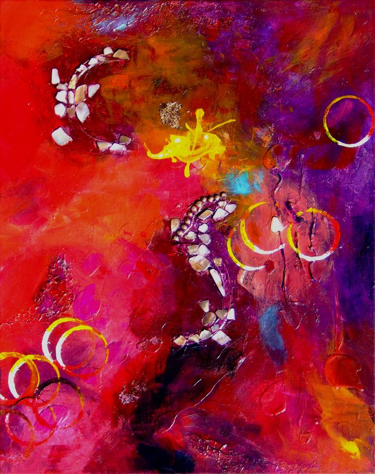 I had a very different plan when I started with the piece, but sometimes the artwork has its own mind what it wanted to be. The process started with making texture and patterns with found objects like seashells, experimenting the color scheme, method of execution which ended up with a spacecraft fl...
