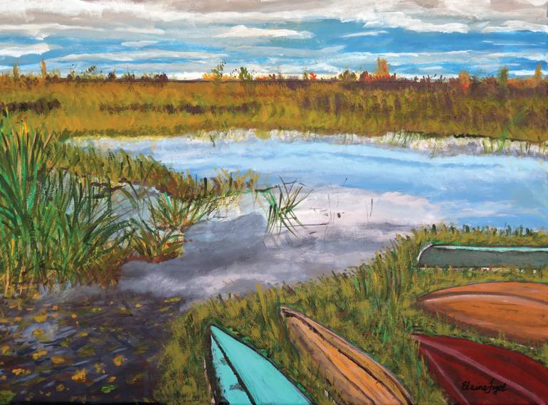 This painting captures a tranquil moment in nature where land meets water in a peaceful wetland scene. Rendered in rich, expressive brushstrokes, the composition draws the viewer into a reflective world of stillness and subtle color. Inspired by photographer, Gilles Rivard of Quebec, it features fou...