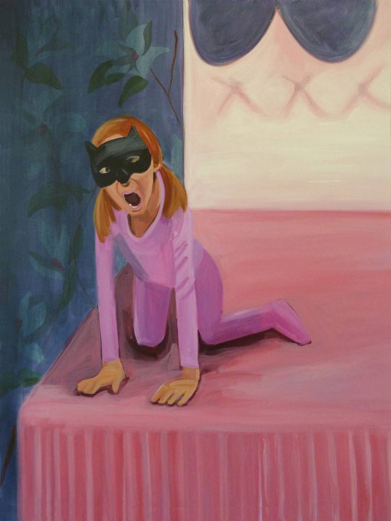 Little girl in pink pajamas wearing a batman style mask and screaming out at the viewer.