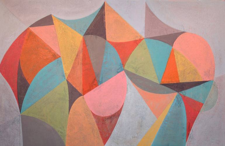 A colorful composition of hard-edged shapes, interspersing unsaturated grays and browns with saturated color. Previous color is evident in the texture of the finished piece. To me, this painting conveys a festive feeling.