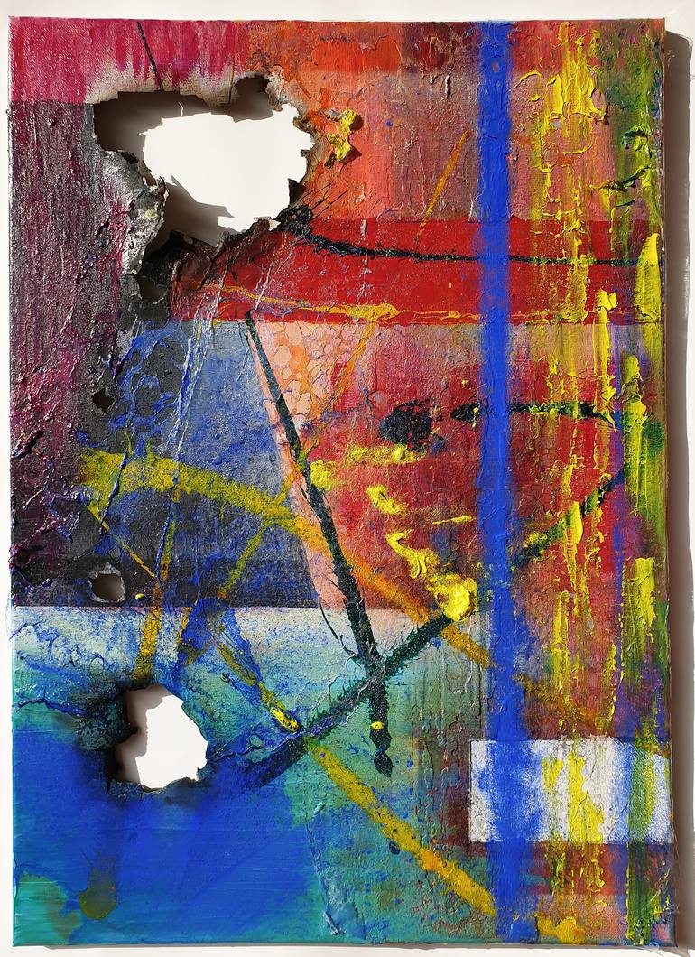 The revenge of space through the canvas. Plastic, live pigment, gesso and acrylic let us see the something "Else" behind them, through two holes generated by fire. What you can see? (All photos are taken in the sunlight. A different effect may be due to incorrect lighting).