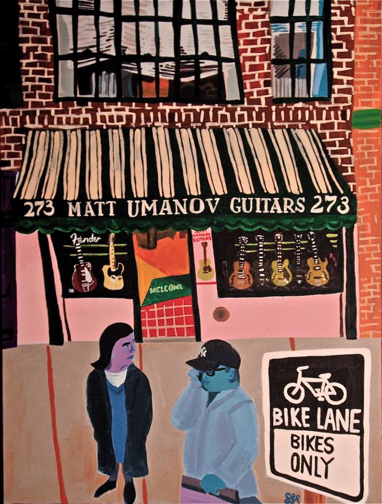 Acrylic painting of Greenwich Village Guitar shop, Matt Umanov's. 40 inches tall by 30 inches wide. Extra wide gallery style sides. Historic insider guitar mecca in the middle of New York's Greenwich Village. I probably owe them rent, for hanging out and poking around on Saturdays but never buy...