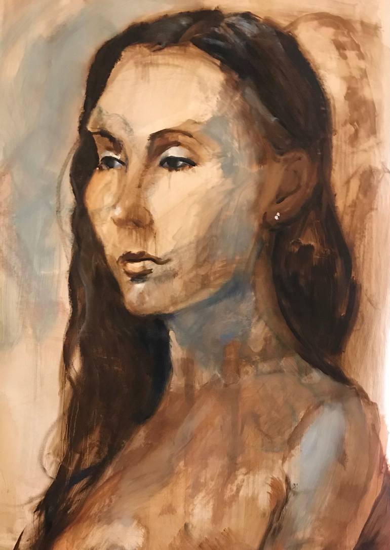 This portrait was painted on a canvas surface that was prepared with random blocks of brown and blue, some of which incorporated into the figure giving it a slightly abstract feel.