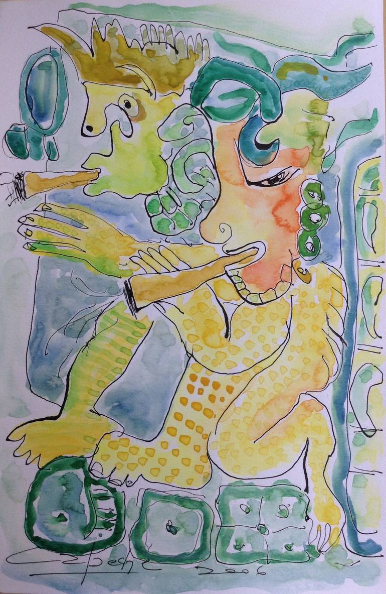 Based on the Maya codices paintings, these were hieroglyphs and drawings that narrated their myths and history , there is much still undeciphered , they are all prior to the Spanish conquest . In these watercolors I reinterpret their designs.