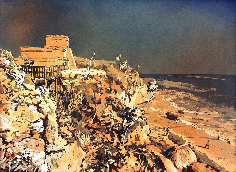Mayan ruins at beach of Tulum in Mexico. Watercolor painting of Mayan ruins in Tulum in Yucatan Peninsula- Mexico. 22x30" poured watercolor painting on Arches professional watercolor paper. Hands signed by artist (not pictured). Unframed. This extraordinary painting is a rare fusion of adventu...